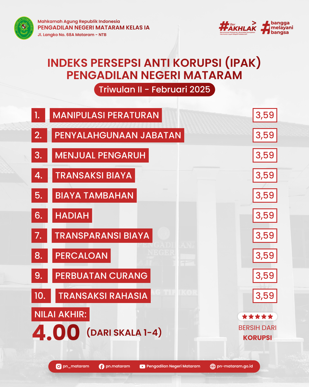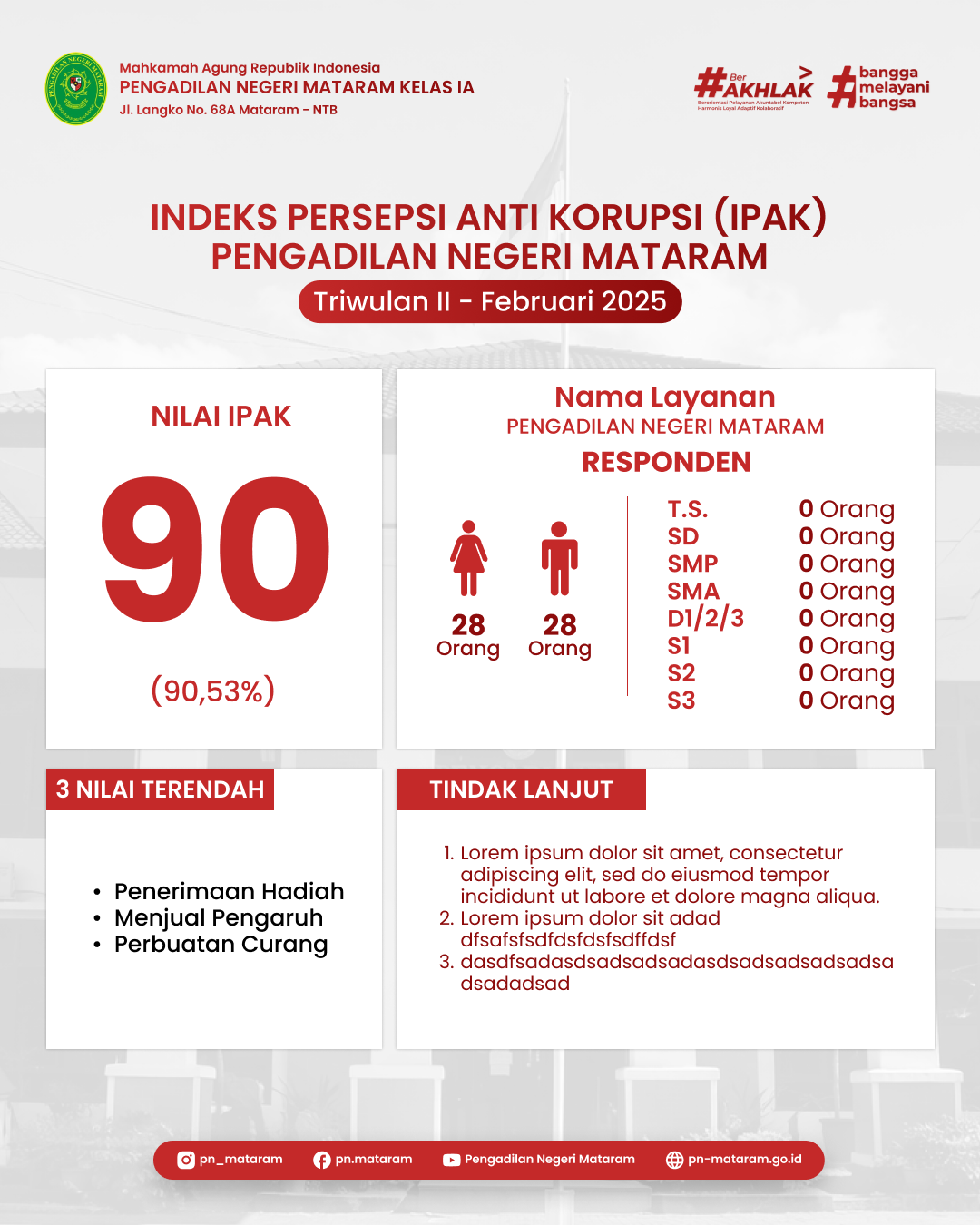 This project involved designing a social media template for the official Instagram account of the Mataram District Court, Mataram City, West Nusa Tenggara. The design was created with consideration for the institution's visual identity, branding consistency, and ease of use by the internal team.